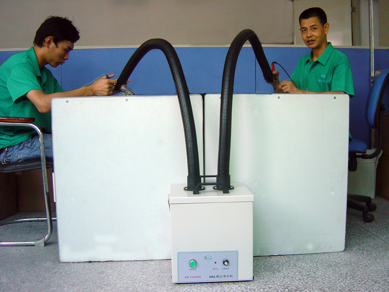 | 大多數(shù)的錫絲屬于無機化合物是一種低毒產(chǎn)品,短時間內(nèi)接觸是沒有明顯的危害的,但長期接觸,或者錫煙濃度達到9.362mg/m3時,容易患錫塵肺,而且對神經(jīng)有一定的毒害! 錫煙影響呼吸道初期問題有:正常呼吸有點困難,干咳,但不會影響工作能力。中期:在呼吸上明顯有點困難,影響工作的發(fā)揮。末期:沒有辦法工作。這個時候消化道出現(xiàn)惡性,嘔吐,腹痛,便秘皮膚可出現(xiàn)潰瘍神經(jīng)毒害,早期為精神萎靡,明顯乏力,后期為慢性頭暈,頭痛。 因此在長期接觸錫煙需要注意防護。SRA焊錫煙霧凈化機,采用點對點凈化,快速、精準、便捷。萬向吸煙手臂,可隨意拉動固定,無需安裝管道,無需外排,凈化后達室內(nèi)排放標準。根據(jù)工位安排可以選擇多種安裝方式。 1.單工位焊錫煙霧凈化機,適合零散、少數(shù)工位。
