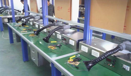 | 外排和室內(nèi)凈化簡(jiǎn)述: (1):外排方式: 整體布管根據(jù)實(shí)際情況使用不同的風(fēng)機(jī),通過(guò)分次布管接到各個(gè)焊錫工位,通常主管直徑在30CM左右,分到次管直徑為5CM到10CM之間,前面也需要加上喇叭口之類的吸煙罩以達(dá)到更好的吸煙效果,風(fēng)機(jī)功率在7.5千瓦左右。一個(gè)7.5千瓦風(fēng)機(jī)能帶上20個(gè)左右焊錫工位![煙霧凈化器] (2):通過(guò)煙霧凈化設(shè)備凈化后直接在室內(nèi)排放: 采用煙霧凈化設(shè)備直接將煙霧廢氣完整的吸過(guò)來(lái),經(jīng)過(guò)凈化處理達(dá)室內(nèi)空氣質(zhì)量標(biāo)準(zhǔn),可直接在室內(nèi)排放。